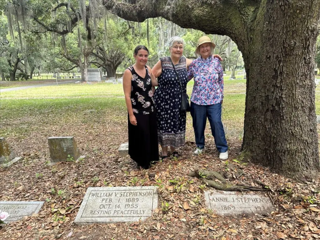 After Jacksonville History Center volunteer Amy Roberts shared with her former UNF professor information about the JHC’s tours of Evergreen Cemetery, Dr. Lynne Stephenson Raiser felt compelled to visit the cemetery in search of two family plots. Raiser had a hard time locating the graves of her great-grandmother Annie Stephenson (d. 1934) and her grandfather, William Stephenson (d. 1955), but eventually found them hidden behind the roots of a large oak tree. She also found two other (empty) family plots.