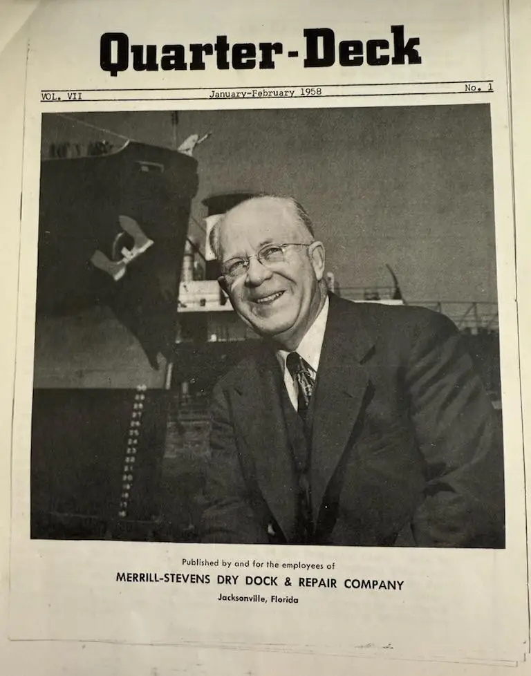 From the Quarter-Deck, published by and for the employees of Merrill-Stevens Dry Dock and Repair Company, January-February 1958: “At the annual meeting held January 27, the Stockholders and Board of Directors of Merrill-Stevens adopted the following resolution which aptly expresses the sentiments of all of us on the passing of our beloved President and Chairman of the Board of Directors, James Campbell Merrill.