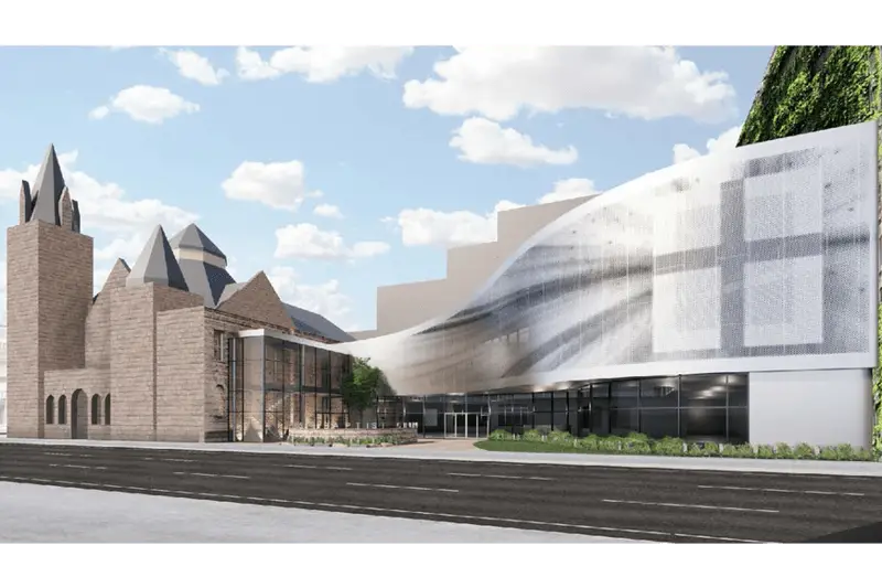 Rendering of a proposed Welcome Center that would replace the former Sunday School building of First Baptist Church. The church has applied for a permit to demolish the 1927 structure to build this Welcome Center.