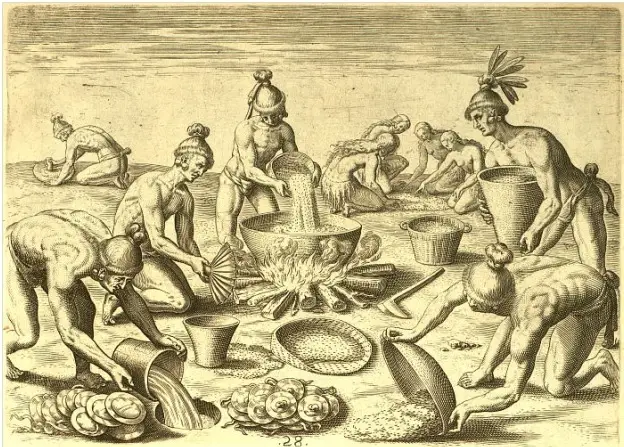 From what we know of the food provisions stocked on Menendez’s ships, the meal that the Spaniards and Timucua shared on September 8, 1565, was probably cocido, a stew made from salted pork and garbanzo beans, laced with garlic seasoning and accompanied by hard sea biscuits and red wine. The Timucua, as invited guests, would have contributed food to the communal meal–likely local game and fish, along with grains, corn, beans, and squash.